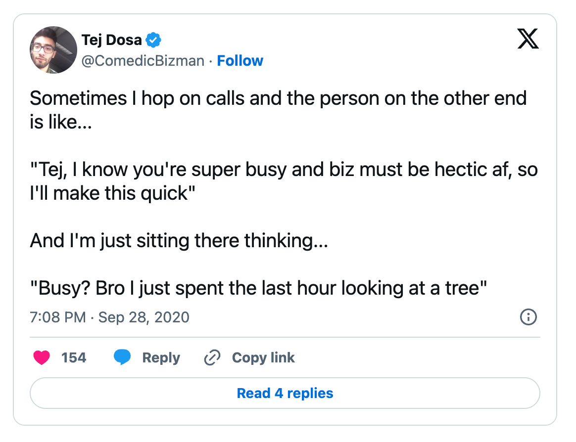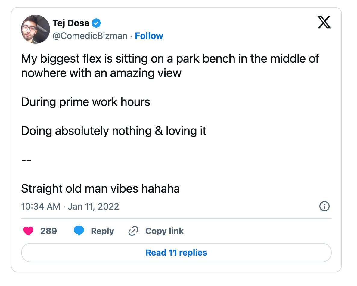 Everything from doing creative work to working with private teachers (on the inner path) to sitting on park benches mid day as I watch the world move by me to running free-flowing conversations (both recorded/unrecorded) with amazing people with no purpose, but to explore what arises freshly in the moment to learning/studying whatever I’m curious about to talking with the homeless to laughing with loved ones to doing nothing to going on adventures to jumping on calls (both biz/personal) to doing more work (if I’m in the midst of a project and in deep focus/work mode).